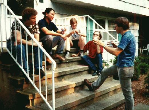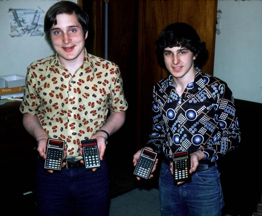 | Bruce and me in our heyday, 1978 (sadly, you just can't buy polyester in that quality any more) From left: Texas Instruments SR-40 HP-25 Texas Instruments SR-55 Texas Instruments SR-56 Originally this page showed a digital picture I took of of the slide projected on a wall, but the picture at the right is a scan of the original slide.